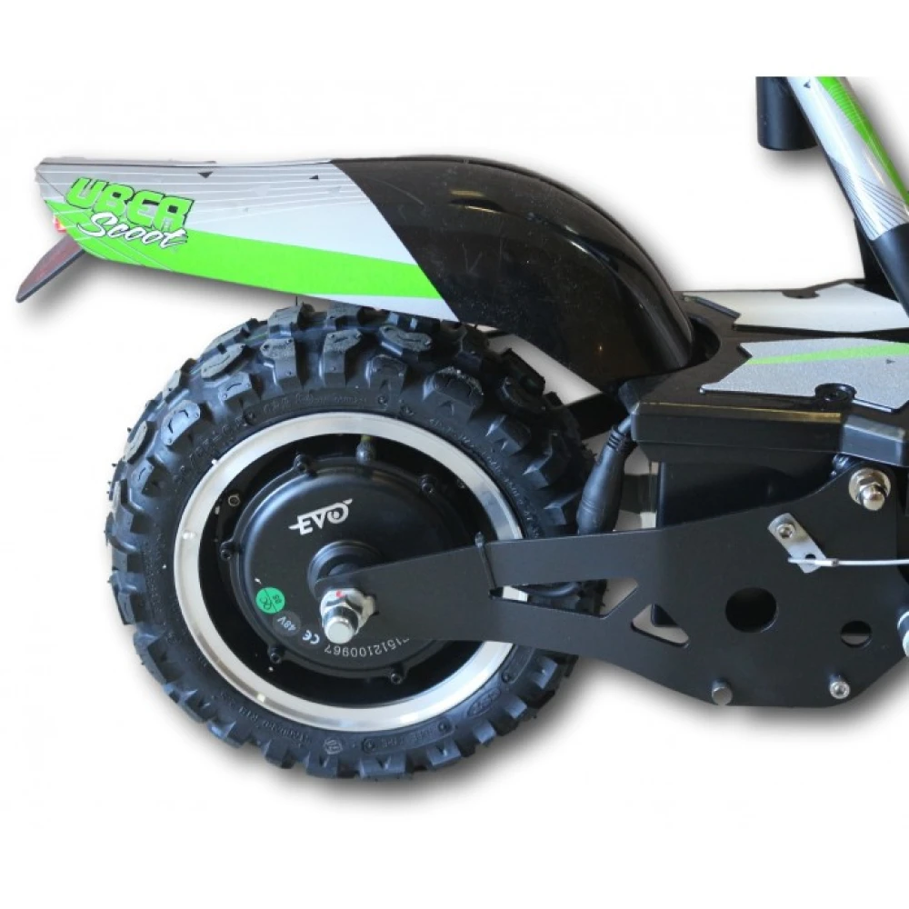 Электросамоката Uber Scoot ES07 имеет аккумулятор 12 А/ч, его емкости хватает на 27 км. Зарядка продолжается 6 часов. Отличительной особенностью этой модели являются широкие колеса 12 дюймов, благодаря этому клиренс 110 мм, и повышенная проходимость. Все это говорит о том, что на этом агрегате можно ездить и по бездорожью. Фары впереди и сзади позволяют пользоваться транспортным средством в темное время суток.