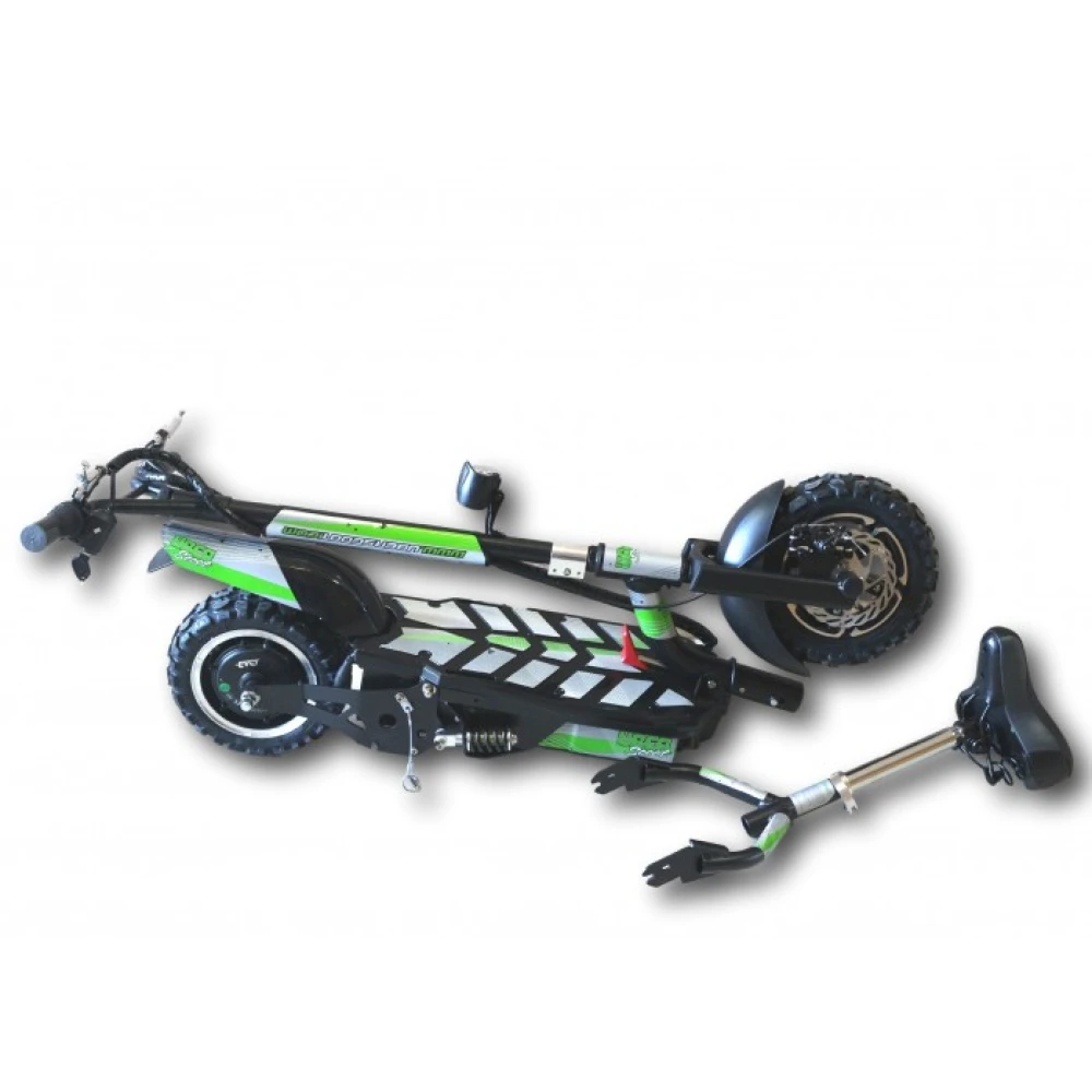 Электросамокат оборудован мощным двигателем 1000 Вт, который позволяет развивать максимальную скорость в 40 км/ч. Тормозная система механическая и дисковая контролирует движение. Позволяя маневрировать в городской суете.  Для комфортного использования транспортного средства есть сидение, регулируемые по высоте, амортизация впереди и сзади. Широкая дека с нескользким покрытием, позволяет удобно расположиться на самокате.