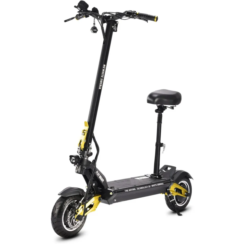Электросамокат white siberia nerpa pro 3600w Gold – быстрый, полноприводный электросамокат от производителя бренда white Siberia. Siberia nerpa pro имеет электродвигатель мощностью 3600w (2 x 60v 1800w) и оснащен аккумулятором с 60V 24A, который заряжается за 6 ч. Данная модель nerpa pro является быстрым средством передвижения, версия pro может похвастаться отличными показателями скорости, а именно мощностью максимальной скоростью до 75км/ч с запасом хода до 70км, это один из самых мощных электросамокатов от данного производителя. Также новинку оборудовали отличными, гидравлическими дисковыми тормозами, размер колес – 11 дюймов, вес модели – 33 кг и максимальная нагрузка до 145 кг. Помимо того, что модель имеет хорошую скорость и набор отличных характеристик, она имеет прочный, легкий корпус из алюминия и подвеску с мощными регулируемыми амортизаторами, благодаря которым электросамокат может проехать любую преграду. Купить электросамокат white Siberia nerpa pro 3600w по хорошей цене можно на нашем сайте от производителя White Siberia.