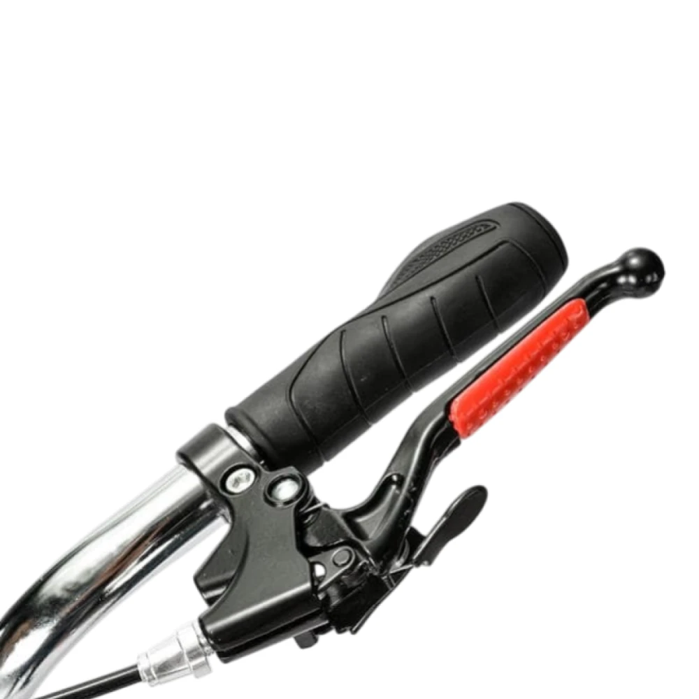 Колёса 20" с широкими протекторами обеспечивают сцепление на грунте/гравии; дисковые вентилируемые тормоза (перед+зад) эффективно тормозят при нагрузке 170 кг. Амортизационная вилка гасит вибрации на неровностях, улучшая контроль; 1 скорость подходит для ровных дорог, на подъёмах требует усилий. Нет режимов или мотора — энергоэффективность высокая за счёт простоты (реальный пробег не ограничен топливом, ~50–100 км/день педалированием).