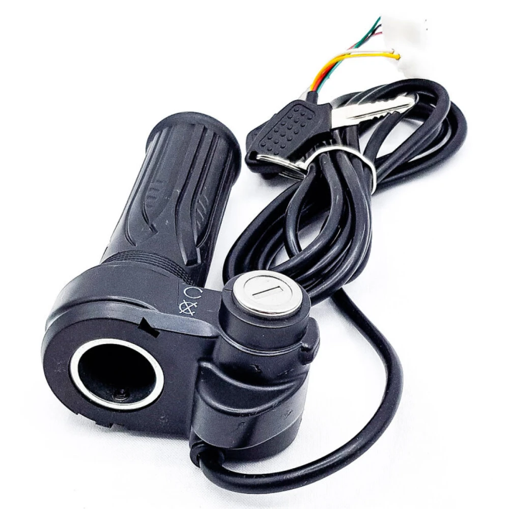 В комплекте: грипса (рукоятка), замок зажигания с ключем, кнопка переключения скорости, акселератор (газуля), шнур (кабель)